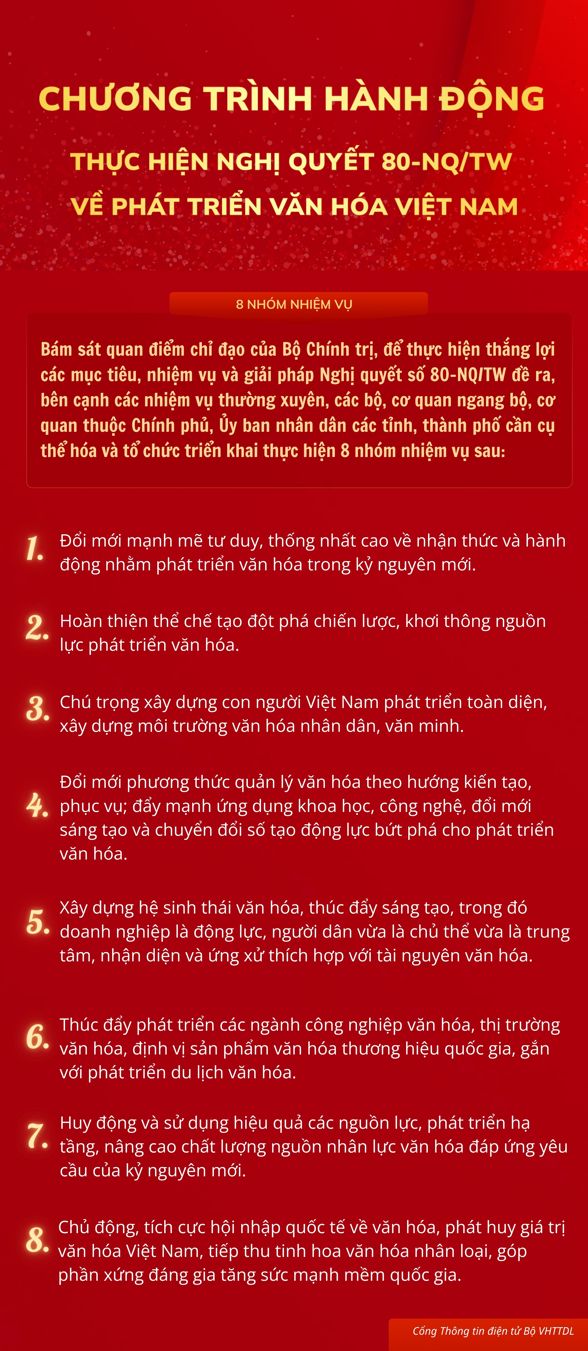 Chương trình hành động của Chính phủ thực hiện Nghị quyết số 80-NQ/TW ngày 07/01/2026 của Bộ Chính trị về phát triển văn hóa Việt Nam xác định nhiệm vụ cụ thể để các bộ, ngành, địa phương xây dựng kế hoạch hành động, tổ chức triển khai đồng bộ, kiểm tra, giám sát, đánh giá việc thực hiện Nghị quyết số 80-NQ/TW để phát triển văn hóa thực sự trở thành nền tảng vững chắc và sức mạnh nội sinh của dân tộc.